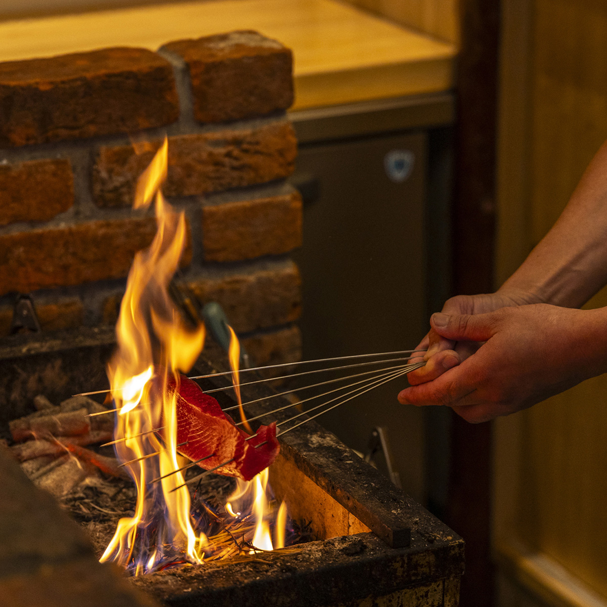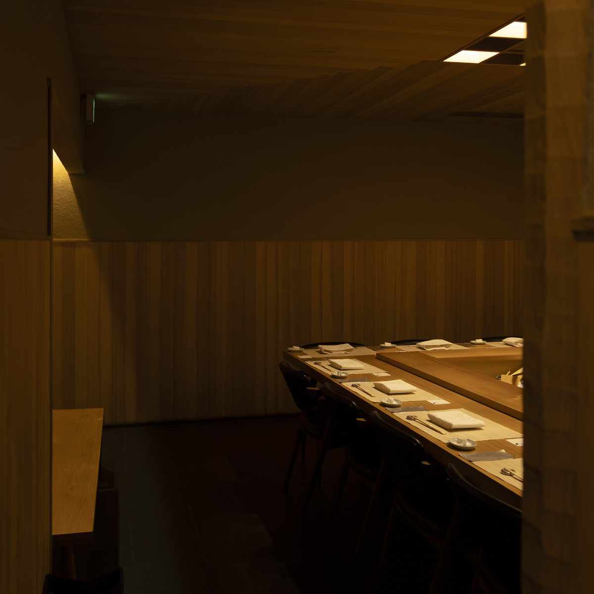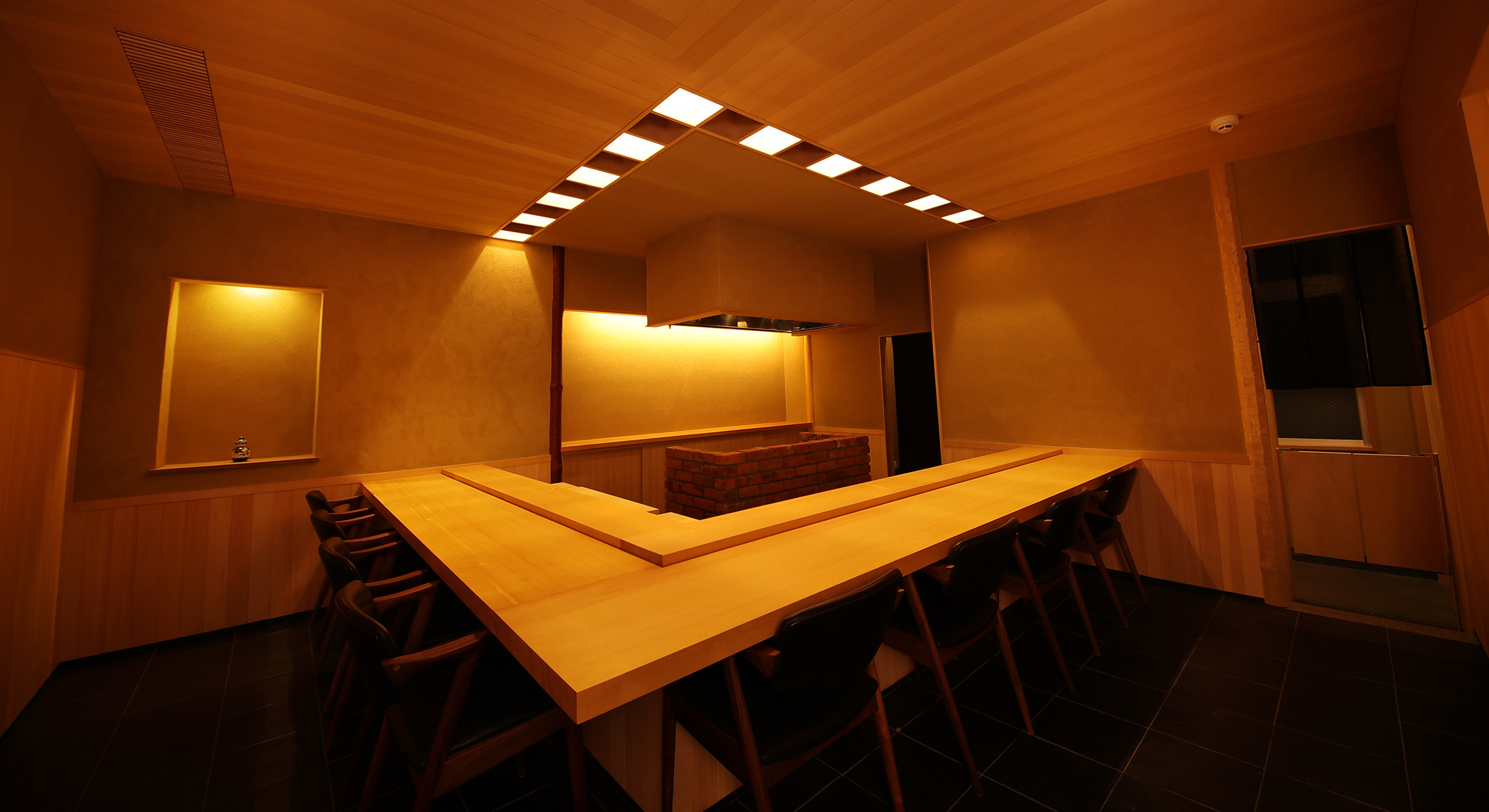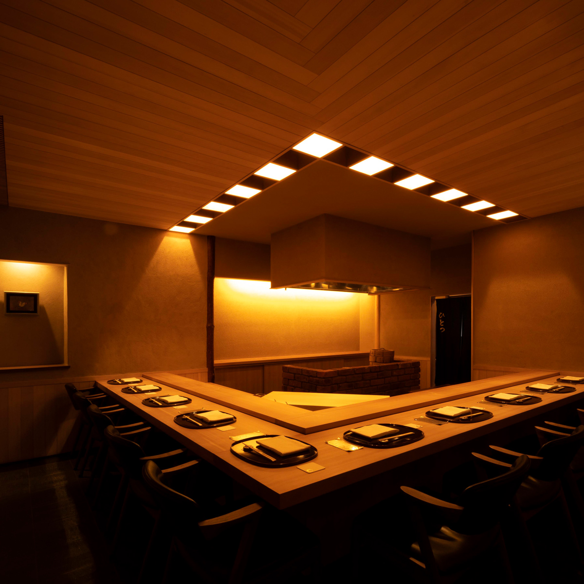 we have created a calm and inviting atmosphere, with a prominent brick grill at the center. Surrounding the grill is an L-shaped counter, allowing the guests to enjoy the live cooking experience of both cooked dishes and sushi right in front.