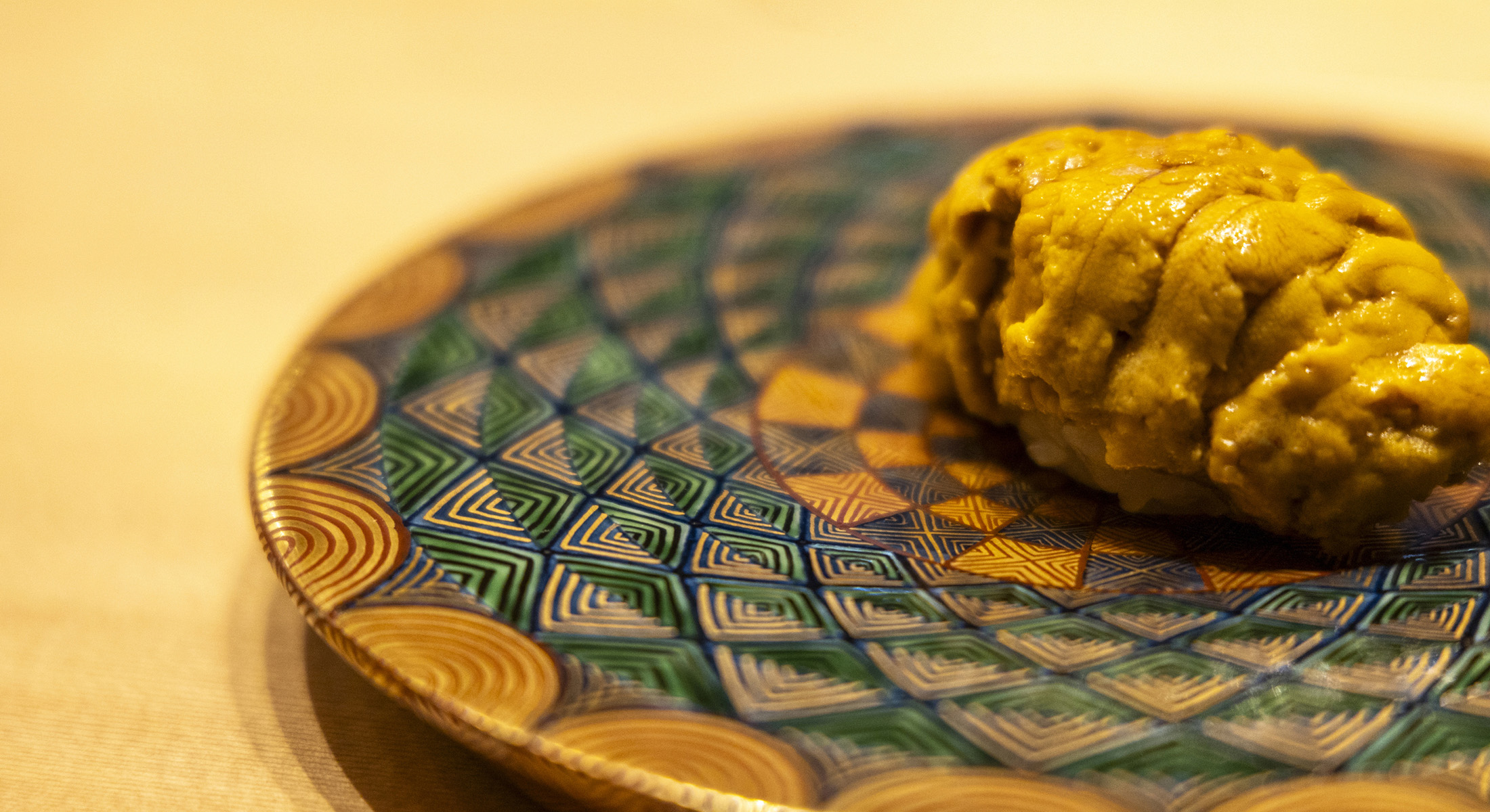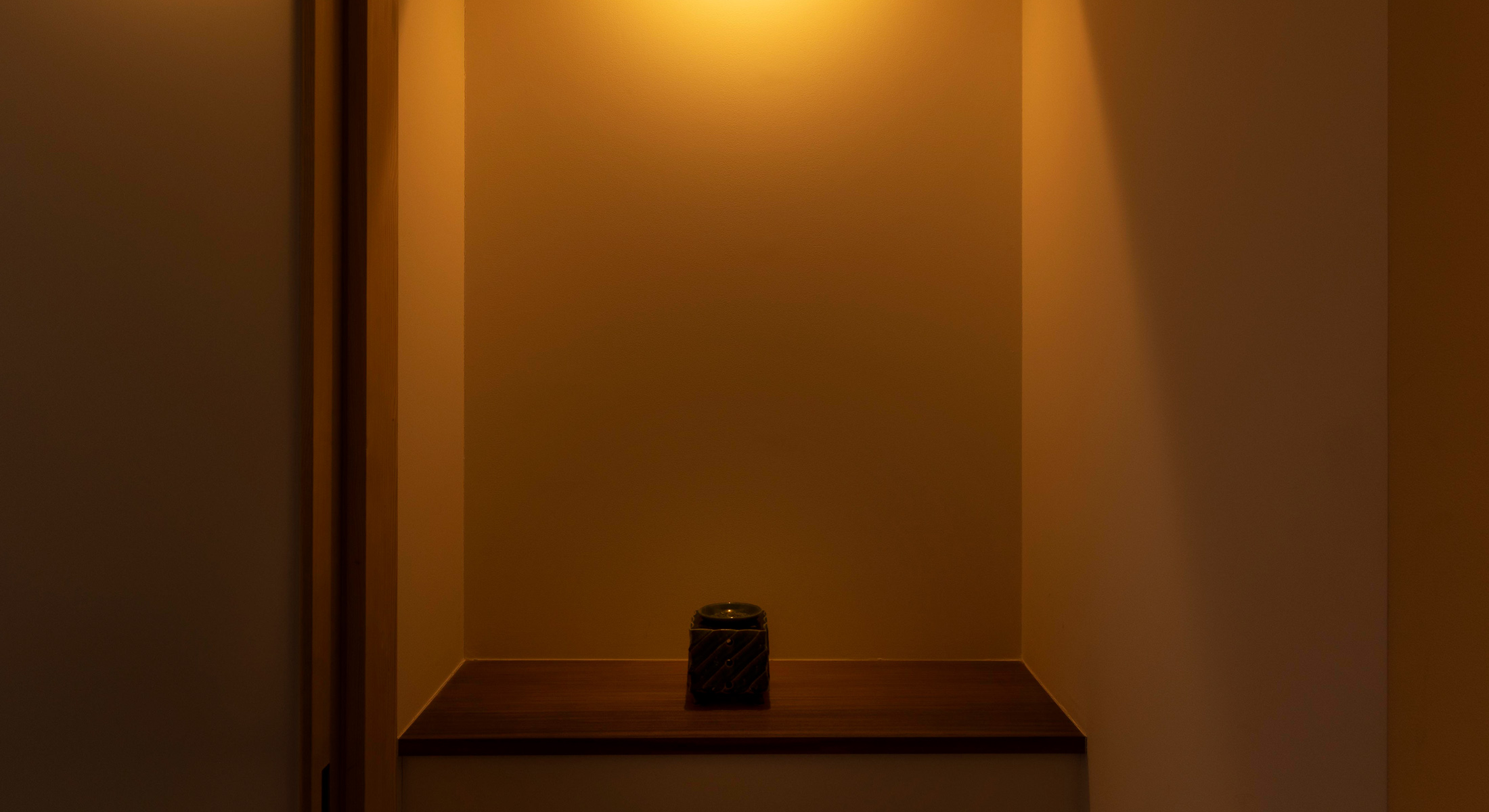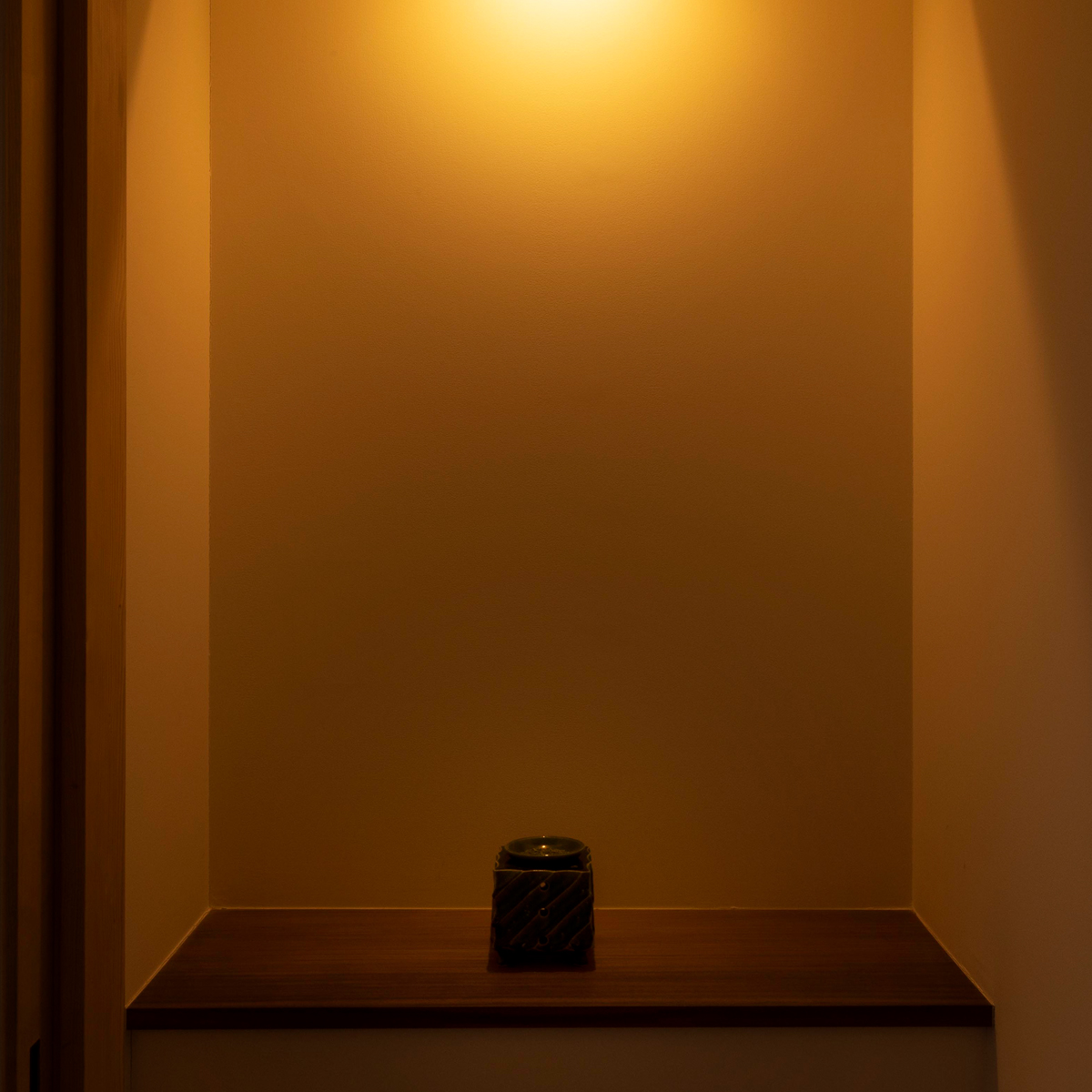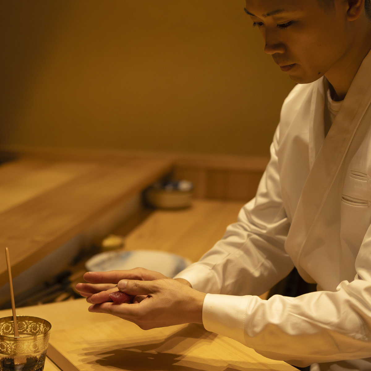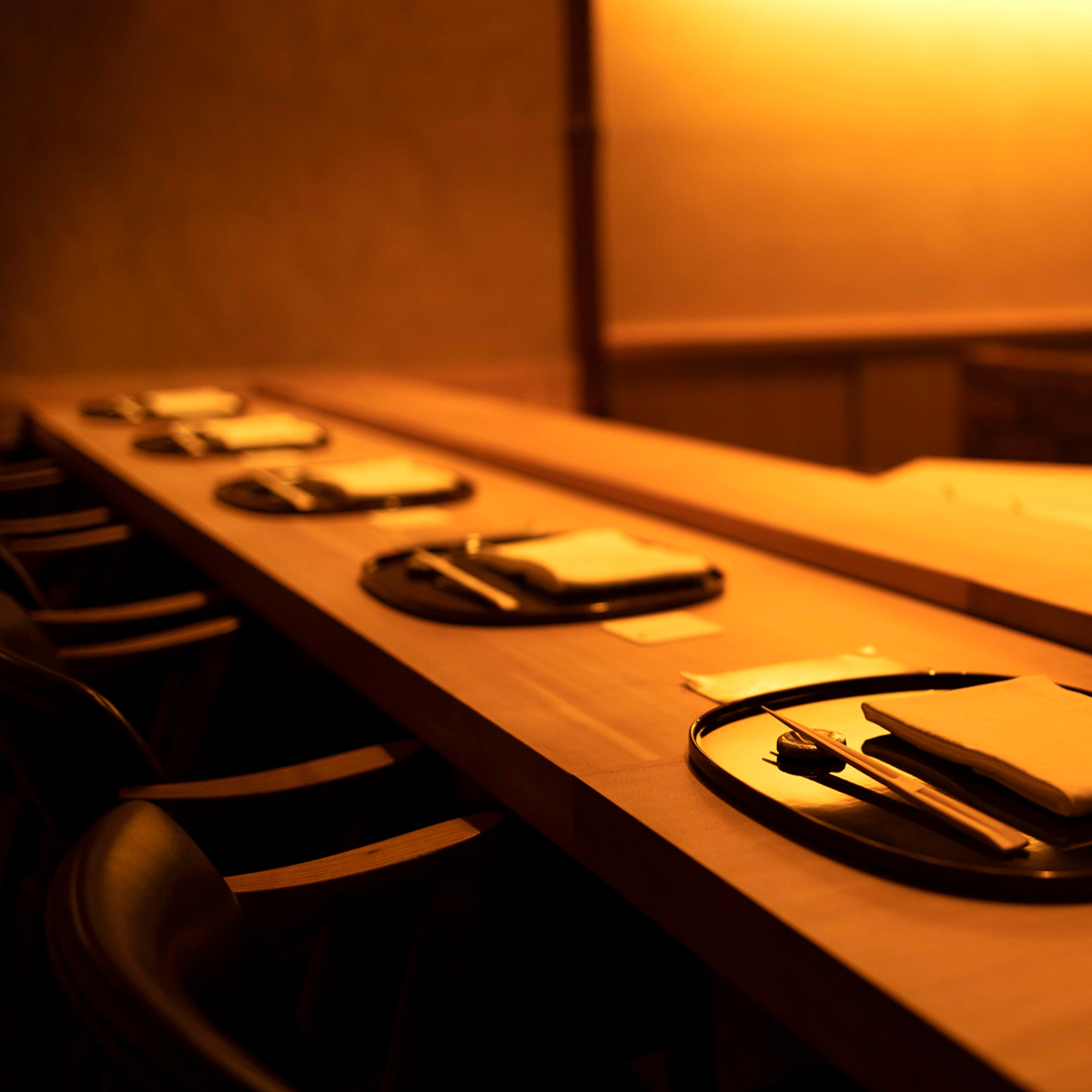we have created a calm and inviting atmosphere, with a prominent brick grill at the center. Surrounding the grill is an L-shaped counter, allowing the guests to enjoy the live cooking experience of both cooked dishes and sushi right in front.